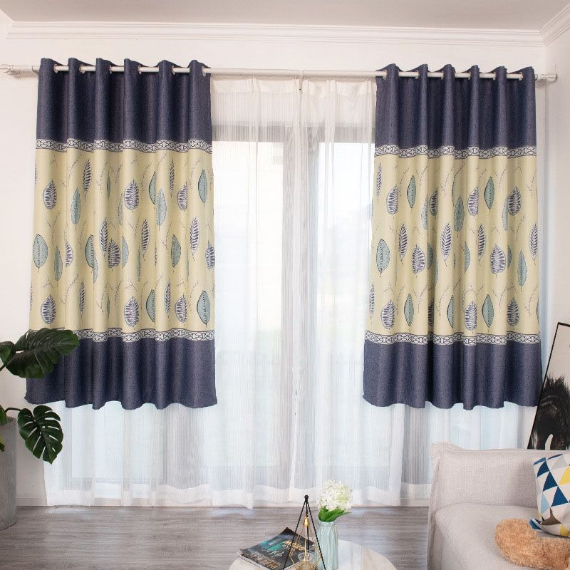2020 Dark Blue Leaves Print Curtains Short Blackout Curtains For