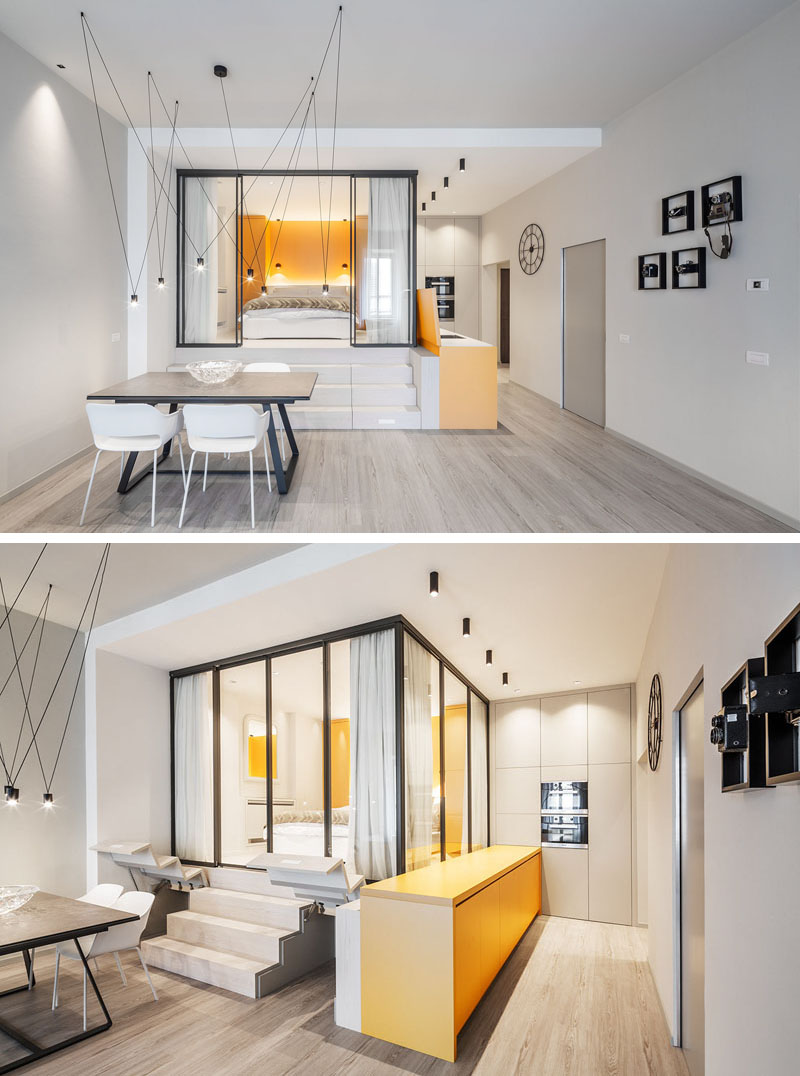 Small Apartment Glass Enclosed Raised Bedroom Under Stair Storage