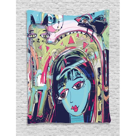 Modern Art Tapestry Funk Style Avatar Woman With Cat On Her Head